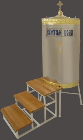 Бак водосвятный применяют для хранения и розлива святой воды. Бак изготовлен из пищевой нержавеющей стали. В его комплектацию входит: - бак на 550 л с подставкой и 3 ступенями; - кран для набора воды, на дне бака расположен сливной кран; - надпись "С