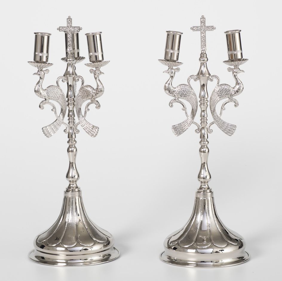 Размерность:шт;Высота, мм:370;Покрытие:Никелирование;Вес нетто, кг:1,6;Диаметр нижний, мм:135;Вес брутто, кг:1,8;Техника исполнения / отделка:Литьё, чеканка;Упаковка габариты, СМ (длина/ширина/высота):38,5 х 30,5 х 15,5;Упаковка опт. габариты, СМ (длина/ширина/высота):38,5 х 30,5 х 15,5;Упаковка (вид):Картонная коробка;Диаметр свечи, мм:18;Материалы основные:Латунь