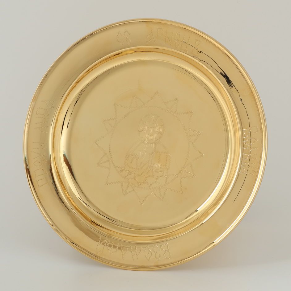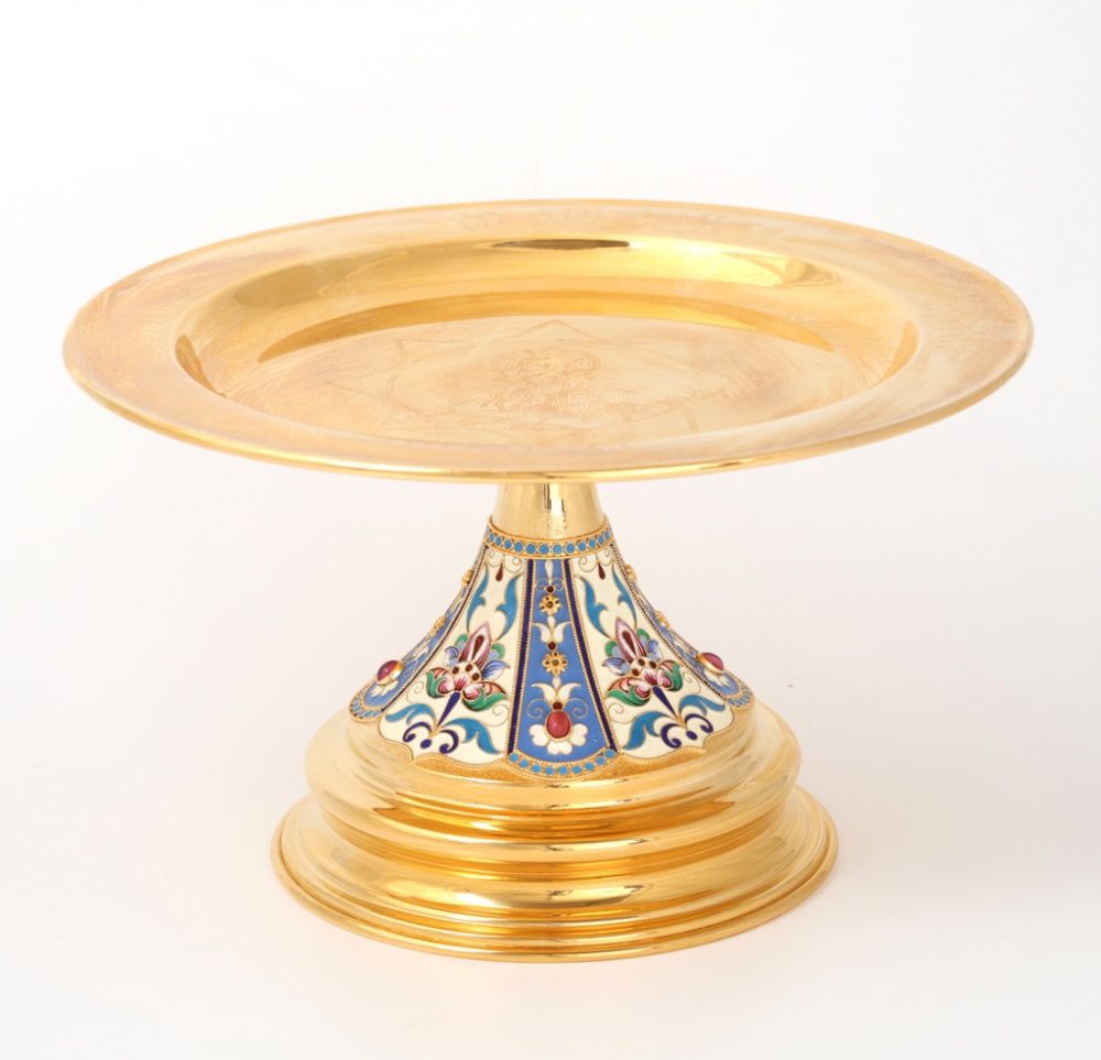 Дискос с поддискосником / ф240мм-конус потира 0, 5л / филигрань, эмаль, роспись, ручная гравировка / золочение