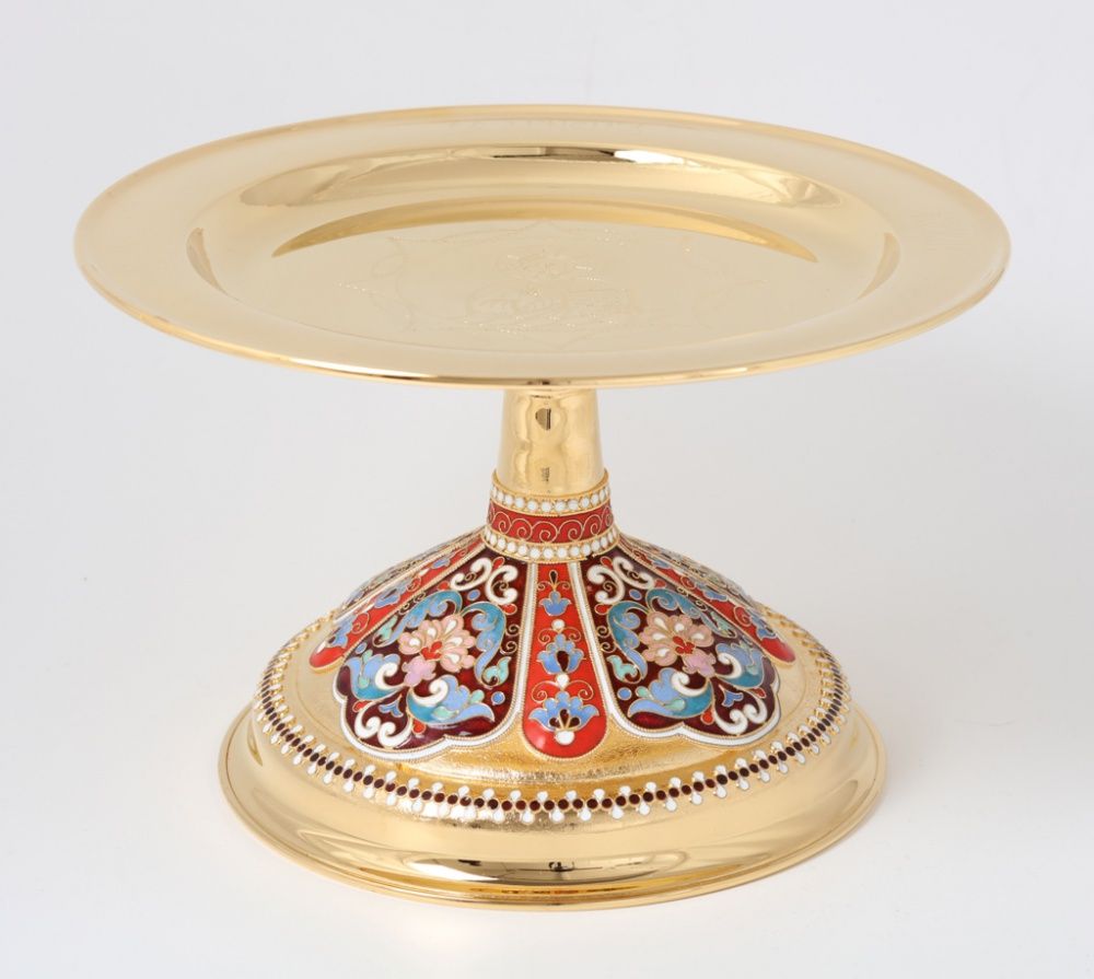 Дискос с поддискосником / ф240мм-потир 1, 0л "№4" / филигрань, эмаль, чеканка, ручная гравировка / золочение