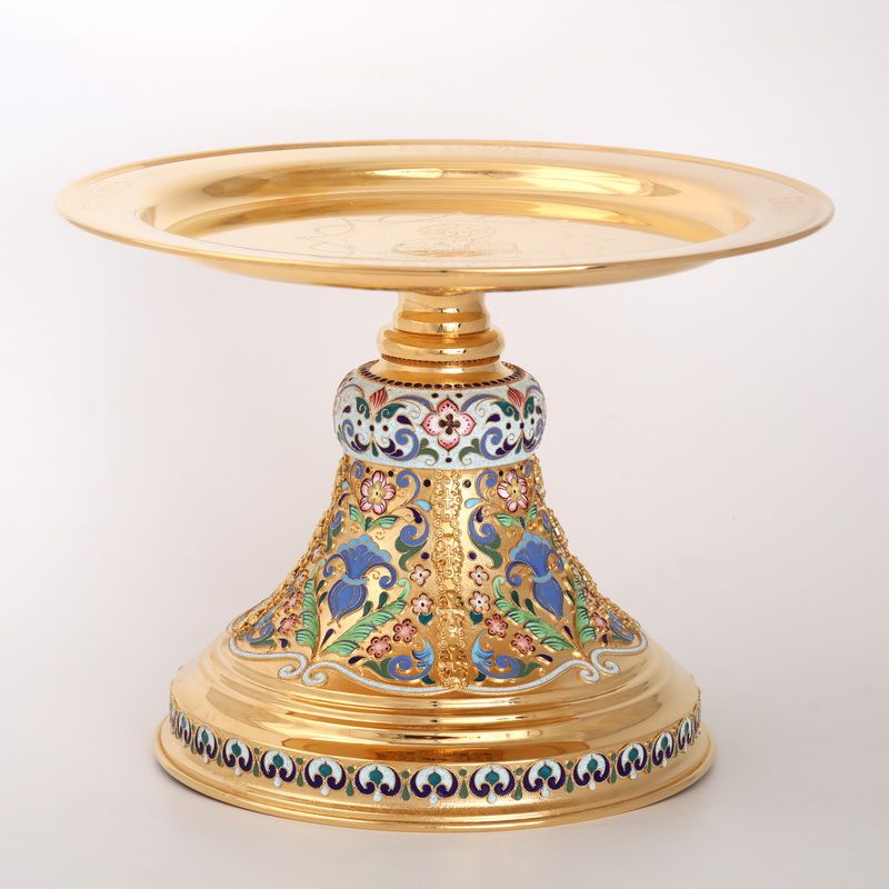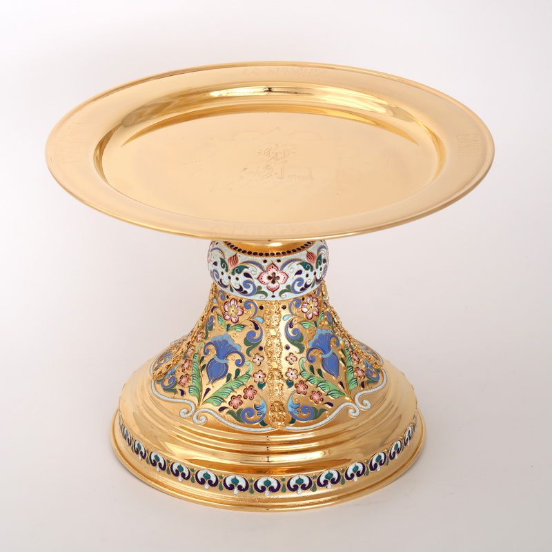 Дискос с поддискосником / ф280мм-конус потира 2, 0л / филигрань, эмаль, роспись, ручная гравировка / золочение