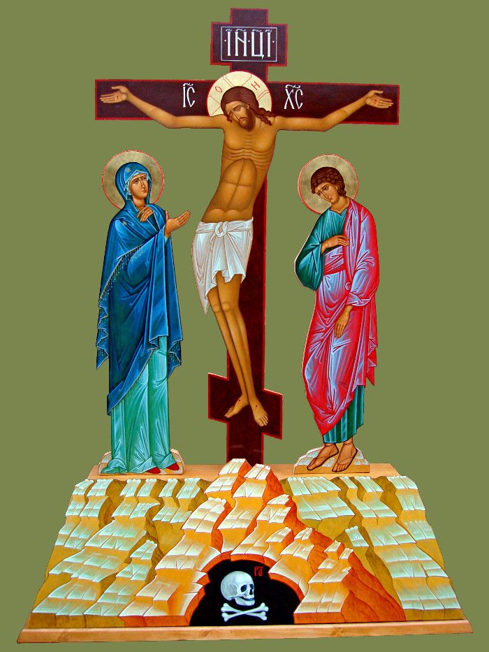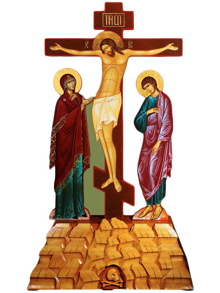 Крест рукописный с предстоящими и резной голгофой  (крест 180 см + голгофа 60 см)