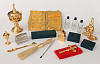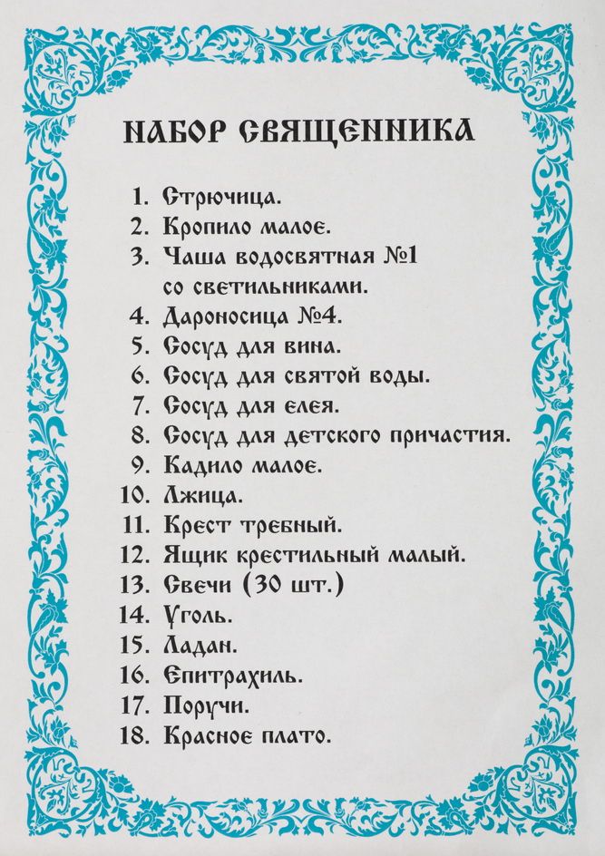 Набор священника: стрючица, кропило малое, чаша водосвятная №1 со светильниками, дароносица №4, сосуд для вина, сосуд для святой воды, сосуд для елея, сосуд для детского причастия, кадило малое требное чеканное, лжица, крест требный, ящик крестильный малый, свечи (30 шт.), уголь, ладан, епитрахиль, поручи, красное плато, подсвечник (7 шт.).