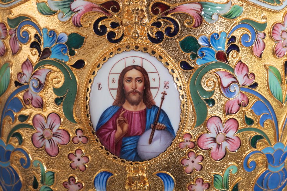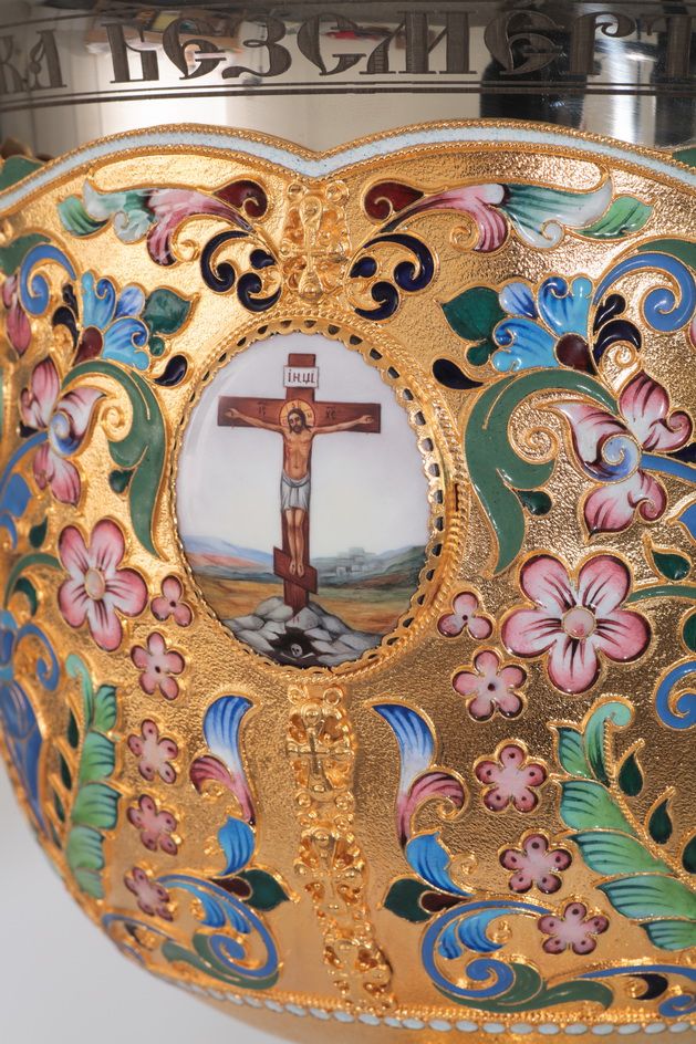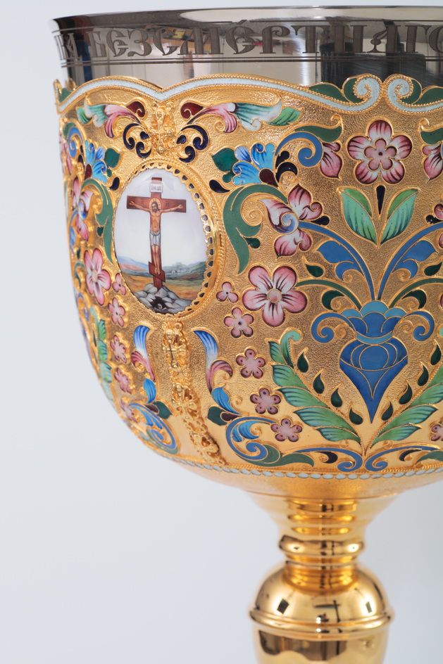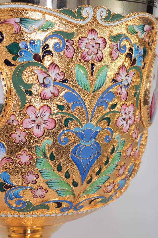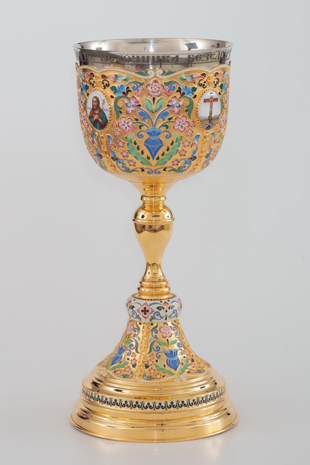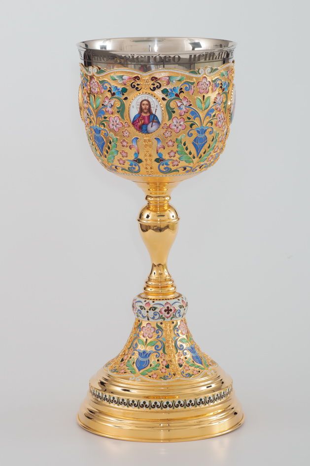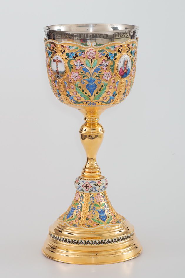 Потир 3.0л 4-финифти, филигрань, эмаль, роспись / поддон конус 2, 0л потира / золочение / мельхиоровый стакан