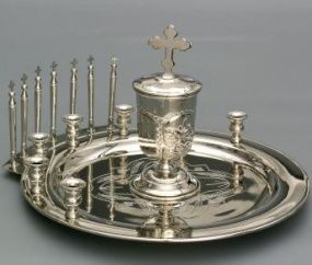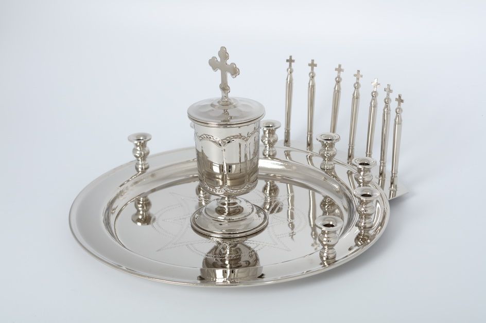 Вашему вниманию предлагается прибор для соборования. Этот товар непременно порадует Вас своим качеством, сделан из металла под названием никель с помощью чеканки. Очень удобная конструкция: шесть подсвечников, а по середине красивая чаша для масла с крышк