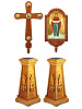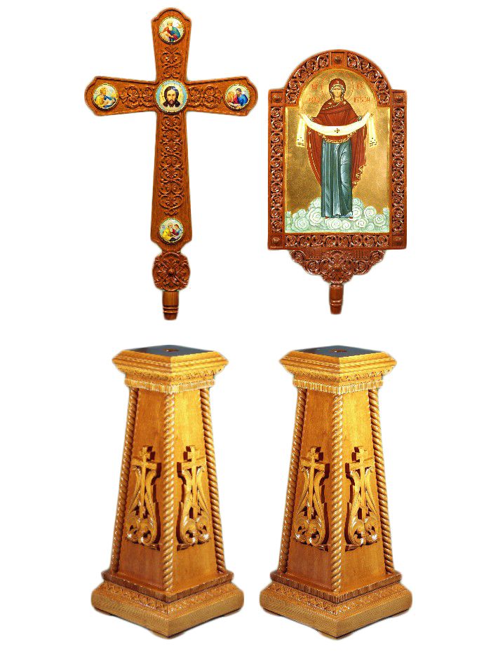 Запрестольный набор: 2 тумбы, крест и икона резные. Размеры: тумба 43х43х100см; икона 64х38см; крест 73х45см. Можно приобрести отдельно: тумба запрестольная, артикул 29104, икона резная на шесте, артикул 29102-1, крест резной на шесте, артикул 29103-1.. Стоимость доставки уточните у оператора